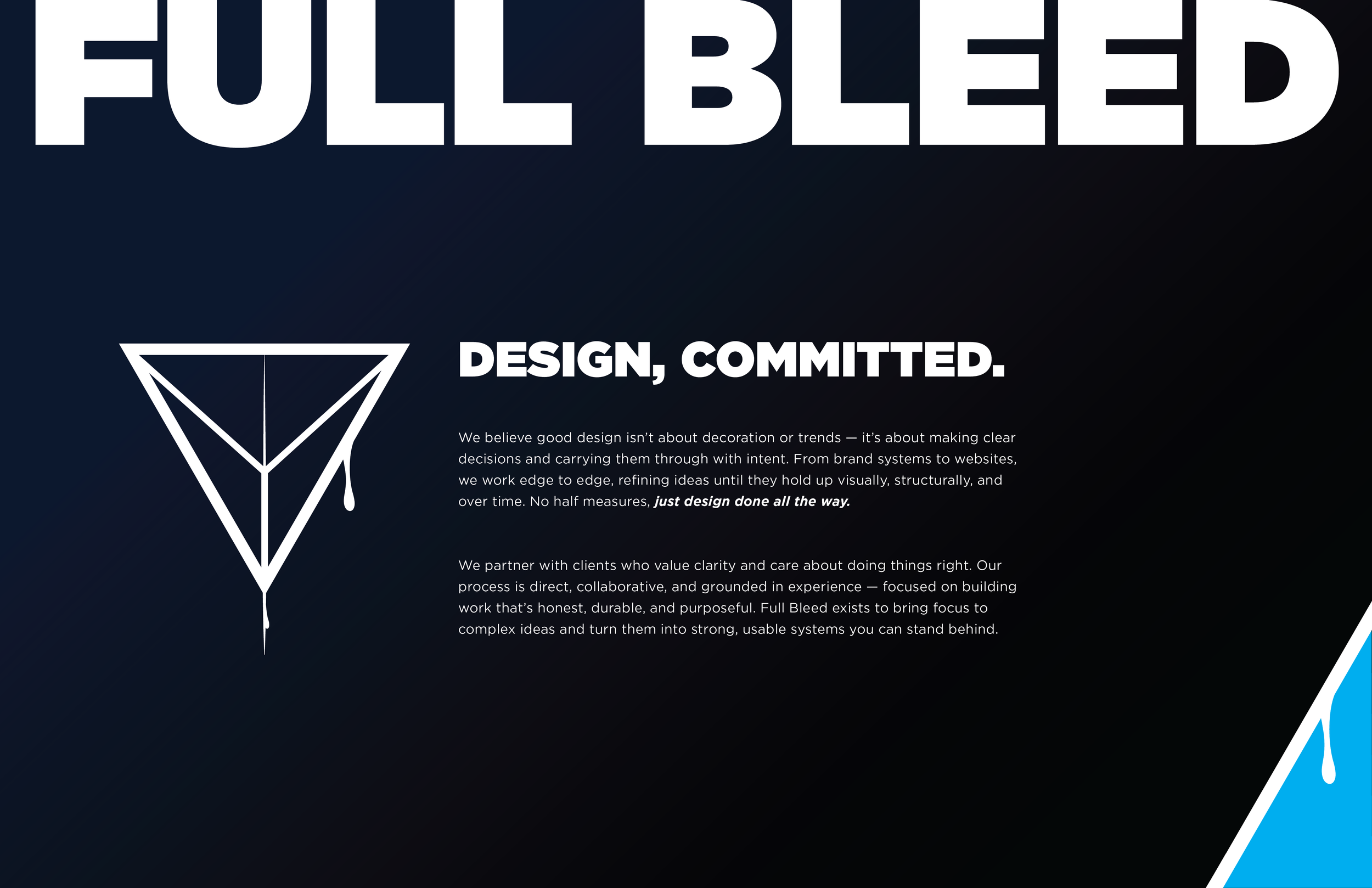 Full Bleed is the creative and web agency I founded to reflect how I believe design should be done — with clarity, intent, and full commitment to the work. Built from the ground up, Full Bleed represents a shift toward more honest, structured, and purposeful design. The name itself comes from a print term, symbolizing the idea of carrying decisions all the way through, without compromise or hesitation.